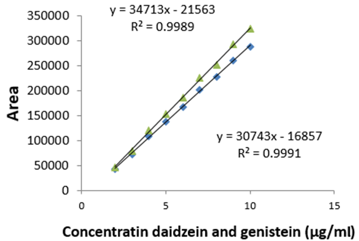 Fig. 4: The relationship between the concentration of daidzein and genistein (x-axis) and peak area (y-axis)