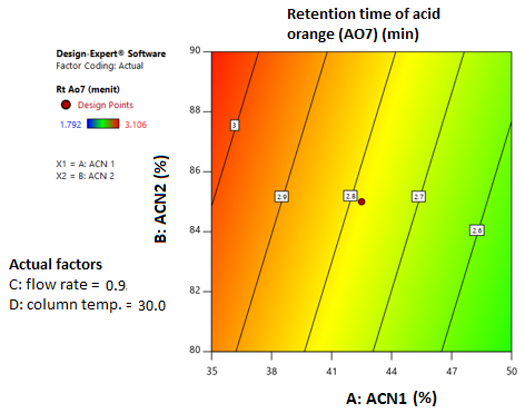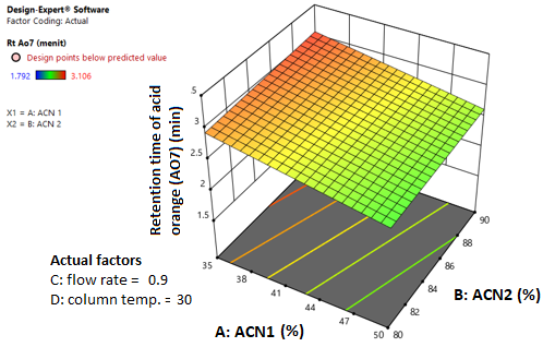 The statistic results revealed that Adj. R2obtained was<0.8, which indicated that the experimental model was not good fit using polynomial equation [21]. Difference Predicted R² with the Adjusted R² in all respons less than 0.2. Eq.1 informed that that variables of the concentration of acetonitrile 1 (%)(X1), the concentration of acetonitrile 2 (%) (X2), flow rate (X3) and column temperature (X4) have a negative effect on the retention time of AO7.