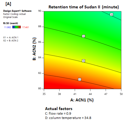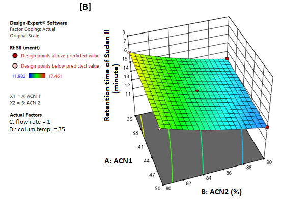 Fig. 3: The contour plot of retention time of Sudan II 7 (SII) [A] and 3D surface graph of retention time of SII [B] as a results of variables of concentration of acetonitrile 1 (%) (ACN1), concentration of acetonitrile 2 (%) (ACN2), flow rate and column temperature