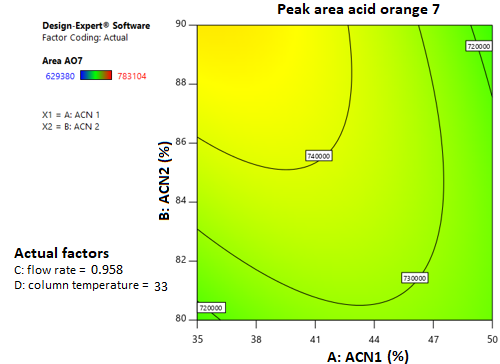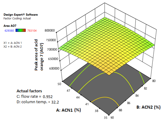 Fig. 4: The contour plot of peak area of acid orange 7 (AO7) [A] and 3D surface graph [B] as a results of variables of the concentration of acetonitrile 1 (%) (ACN1), a concentration of acetonitrile 2 (%) (ACN2), flow rate and column temperature