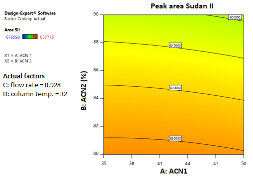 The equation 4 showed the correlation between the response of peak area of Sudan II (SII) and independent variables of X1, X2, X3 and X4 along with its interaction.