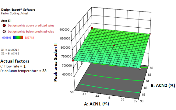Fig. 5: The contour plot of peak are of sudan II (SII) [A] and 3D surface graph of SII [B] as a results of variables of the concentration of acetonitrile 1 (%) (ACN1), the concentration of acetonitrile 2 (%) (ACN2), flow rate and column temperature