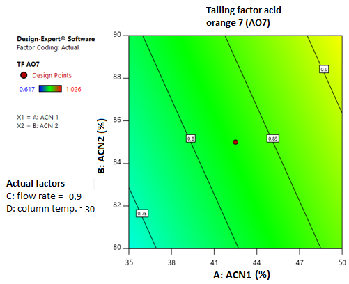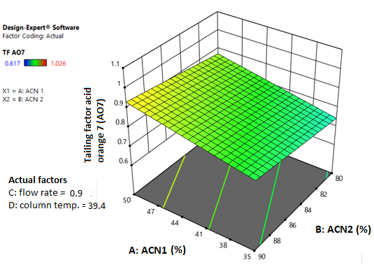 Fig. 6: The contour plot of tailing factor of acid orange 7 (AO7) [A] and 3D surface graph [B] as a results of variables of the concentration of acetonitrile 1 (%) (ACN1), the concentration of acetonitrile 2 (%) (ACN2), flow rate and column temperature