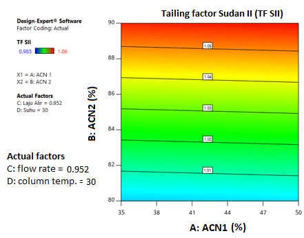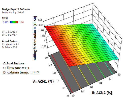 Fig. 7: The contour plot of tailing factor of sudan II (SII) [A] and 3D surface graph [B] as a results of variables of the concentration of acetonitrile 1 (%) (ACN1), the concentration of acetonitrile 2 (%) (ACN2), flow rate and column temperature