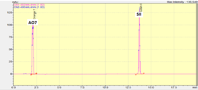 AO7 and SII were analysed using chromatograph of Shimadzu LC 20AD chromatograph equipped with photo-diode array (PDA) (Shimadzu LC 20AD, M20A PDA Detector) at wavelength of 300-650 nm. Separation of analytes was performed using C18 column (Thermo Synergy Gold 250 mm x 4.6 mm i.d., 5 µm). The mobile phase was modified from method of determining sudan dyes [12], used acetonitrile-water as solvent (1:1 v/v), the composition of acetonitrile was optimized at 35-50% for separation AO7 (ACN 1), 80-90% for SII (ACN 2), delivered at flow rate of 0.9–1 ml/min, using column temperature of 30-40 °C.