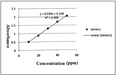 The UV spectrum of amlodipine besylate was obtained by using a UV-visible spectrometer (UV-2450, Shimadzu). Accurately weigh 10 mg of the drug was added to 100 ml of volumetric flask. Volume was made up to 100 ml with water (100 μg/ml). This solution was used as a stock solution. From this solution (100 μg/ml) suitable working solutions of different concentrations of 10, 20, 30, 140, and 50 μg/ml were prepared. The resultant solution was scanned from 400 to 200 nm, and the spectrum was recorded to obtain the value of the maximum wavelength in the respective solvents. The absorbance of each standard solution was determined spectrophotometrically. Using absorbance concentration data, Beer-Lambert’s plot was constructed [11].