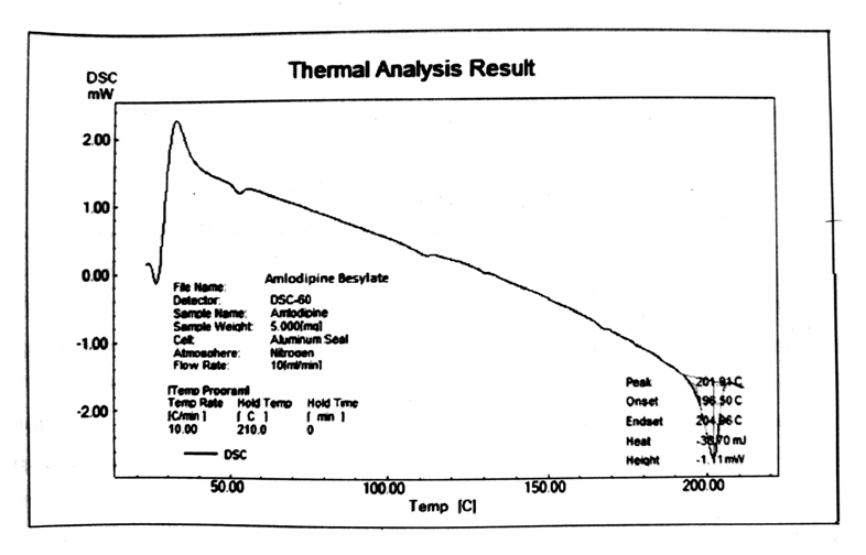 Thermal analysis of drugs carried out using DSC. The DSC curve of amlodipine besylate profiles a sharp exothermic peak at 106.53 °C corrosponding to it’s melting, and indicating it’s crystalline nature and purity of the sample. The DSC of thermogram is shown in fig. 6. [28].