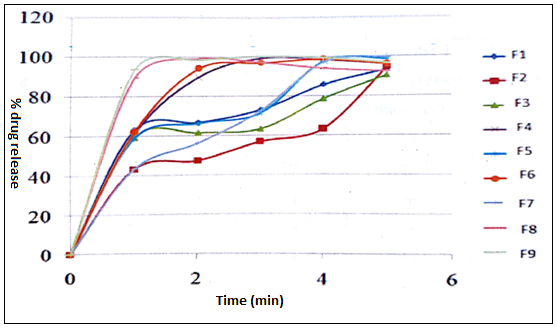 Drug content found in the fast dissolving tablets resembling that of literature value. Range of drug content is 95.16%-101.28%. Therefore uniformity of content was maintained in all formulations. Drug content of all formulations is listed in table 4. [24].