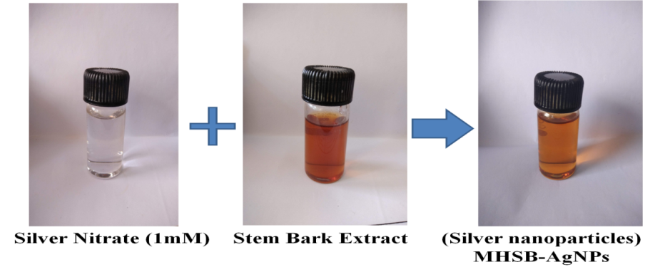 Fig. 3: Silver nitrate solution mixed with stem bark extract gives Manilkara hexandra stem bark silver nanoparticles (MHSB-AgNPs)