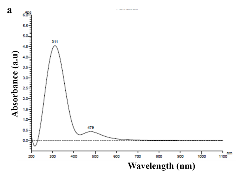 The Manilkara hexandra stem bark extract and MHSB-AgNPs were first determined by UV-visible spectrum wavelength ranging from 300-1100 nm. Where double distilled water was used as reference [17]. The UV-visible absorption spectrum of bio-synthesized Manilkara hexandra stem bark silver nanoparticles (MHSB-AgNPs) is analyzed at various intervals of time. It has an optical absorption range from 430-440 nm and for the stem bark extract, it is 311 nm shown in fig. 4a and fig. 4b.