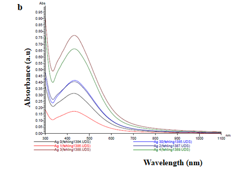 Fig. 4: UV-Vis spectroscopy for a.) Manilkara hexandra Stem Bark Extract b.) Synthesized Manilkara hexandra stem bark silver nanoparticles (MHSB-AgNPs) for different time intervals (Black-0 min, blue-30 min, red-1h, Dark blue-2h, Maroon-3h, Green-4h)
