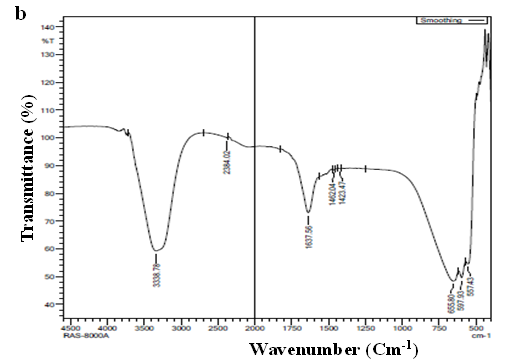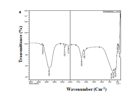 Fig. 5: Fourier transform infrared spectroscopy of a.) Manilkara hexandra aqueous stem bark extract and b.) synthesized Manilkara hexandra stem bark silver nanoparticles (MHSB-AgNPs)