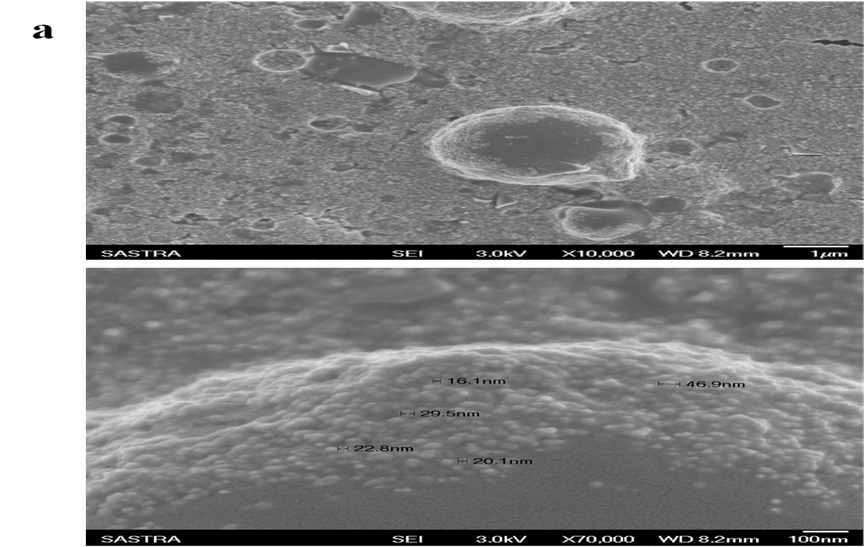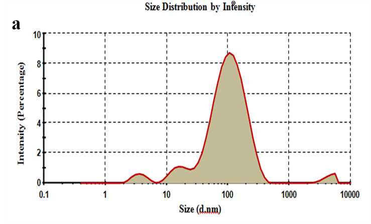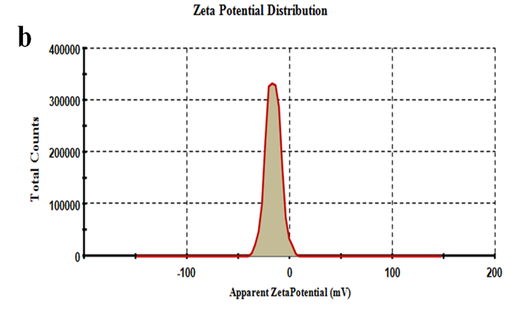 Dynamic light scattering (DLS) analysis shows the average size to be at 68 nm. Dynamic light scattering (DLS) shows a minor peak at 3.7 nm, medium peak at 16.5 nm and a major peak at 121 nm as in fig. 8a. The size of the particles is high in Dynamic light scattering (DLS) compared to Field Emission scanning Electron Microscope (FE-SEM). The Dynamic light scattering (DLS) is measured based on the hydrodynamic diameter of the particles and it provide average particle size whereas Field Emission scanning Electron Microscope (FE-SEM) is examined by dry particles [20]. The high stability of zeta potential (-17 nm) is confirmed from fig. 8b. In zeta potential, the magnitude is predictive for the stability of the nanoparticles [21].