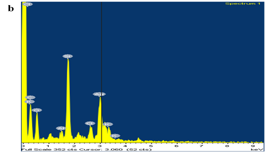 The surface morphology, shapes, size distribution in nano (10-9) and micro (10-6) scales were identified by using Field Emission scanning Electron Microscope (FE-SEM) [19]. Particles are spherical and size ranges from 15-50 nm as shown in fig. 6a. Energy Dispersive Spectroscopy (EDAX) shows the presence of Silver (Ag) which confirms the formation of Manilkara hexandra stem bark silver nanoparticles (MHSB-AgNPs) as shown in fig. 6b. There are also other peaks such as Carbon (C), Chlorine (Cl), Oxygen (O), Potassium (K) they are due to biocompounds from the plant. The Silicon (Si) is due to glass wafer used for coating the nanoparticles.