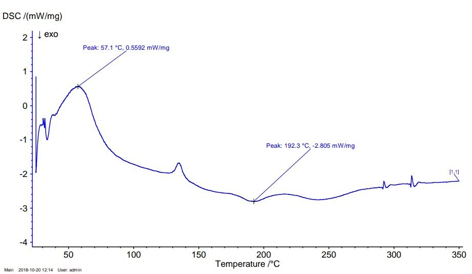 We observe three exothermic peaks at 35˚C, 192.3˚C, 315˚C and four endothermic peak at 57.1˚C, 135˚C, 290˚C and 312˚C. The nanoparticles melt in an exothermic peak at 315˚C. This stage is called as melting stage and the energy is been released by the material at this stage. The nanoparticles are stable until 315˚C. There are also small endothermic and exothermic peaks present in the Differential Scanning Calorimetry (DSC) curve. There are also peaks present in glass transition stage and crystalline stage. These peaks are due to change properties of nanoparticles shown in fig. 10.