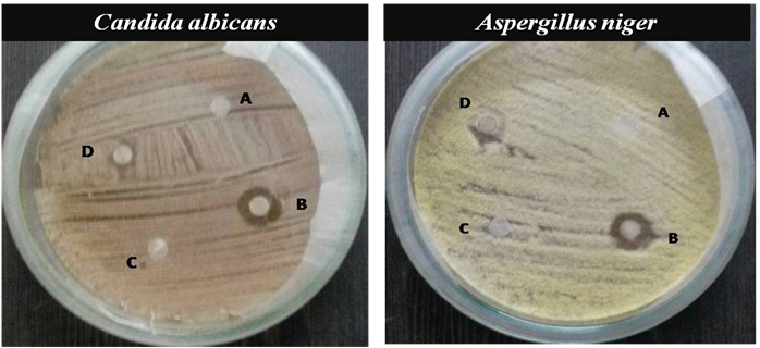 The antifungal activity of stem bark extract, Manilkara hexandra stem bark silver nanoparticles (MHSB-AgNPs), silver nitrate (AgNO3) solution, and standard were determined by disk diffusion method against two fungal stains such as Candida albicans and Aspergillus niger on Sabouraud’s dextrose agar [15]. The testing sample (10 µl/ml) is loaded in 6 mm of an antifungal disc and is compared with Fluconazole as standard.