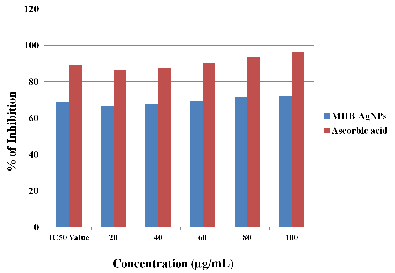 2,2-diphenyl-1-picrylhydrazyl (DPPH) is used for examining free radical scavenging activity. DPPH radicals (0.2 mmol) are prepared in methanol solution. Manilkara hexandra stem bark silver nanoparticles (MHSB-AgNPs) concentration varied from 20-100µg/ml with water mixed with one ml of prepared 2,2-diphenyl-1-picrylhydrazyl (DPPH) solution in a test tube. It is shaken vigorously and kept in a dark room for 30 min after absorbance is measured. Similarly, ascorbic acid is used as a standard to compare the silver nanoparticles. After measuring the IC 50 value is calculated [16].