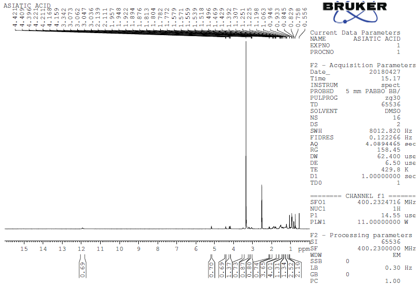 1H NMR spectra of isolated asiatic acid were recorded on a NMR-400 MHz (with multi-nuclei analysis from 1H) and chemical shifts were recorded as δ values. Using TMS as an internal standard and deuterated methanol was taken as solvent [12].
