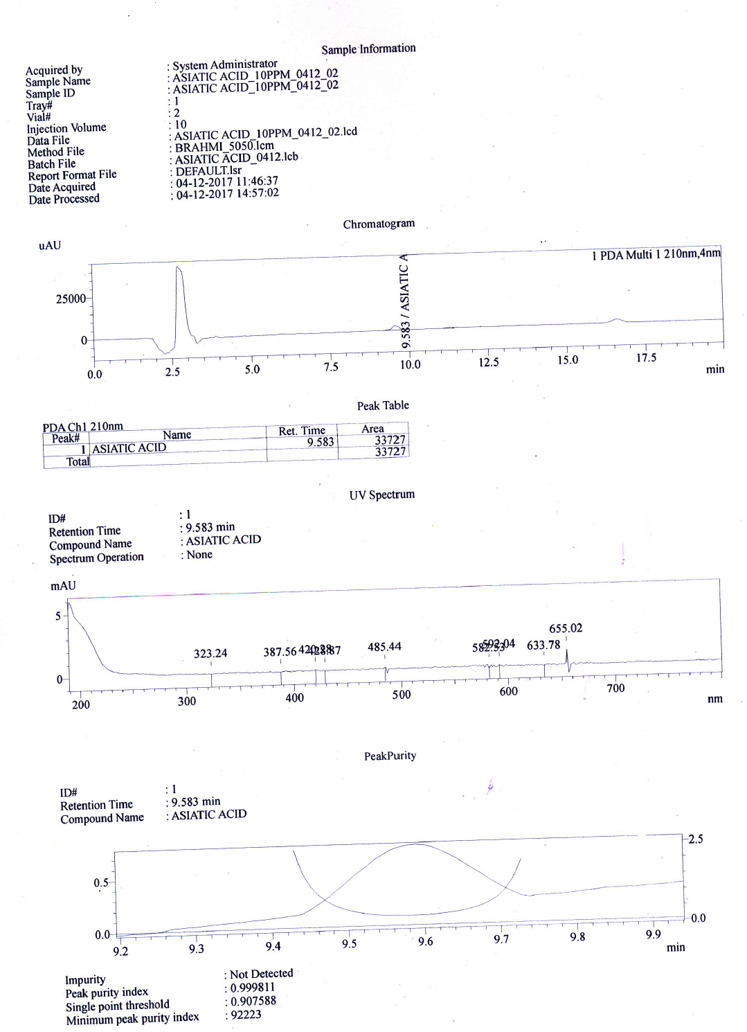 System suitability was acchieved by injecting six replicate injections of standard solution of asiatic acid and followed by determination of % relative standard deviation (% RSD) of peak areas, resolution factor, tailing factor and theoretical plates [13].