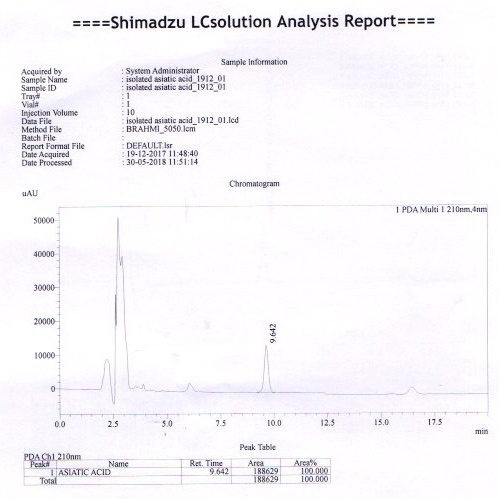 Accuracy studies indicated that the mean recovery of the added standard drug was 99.80% for isolated asiatic acid.