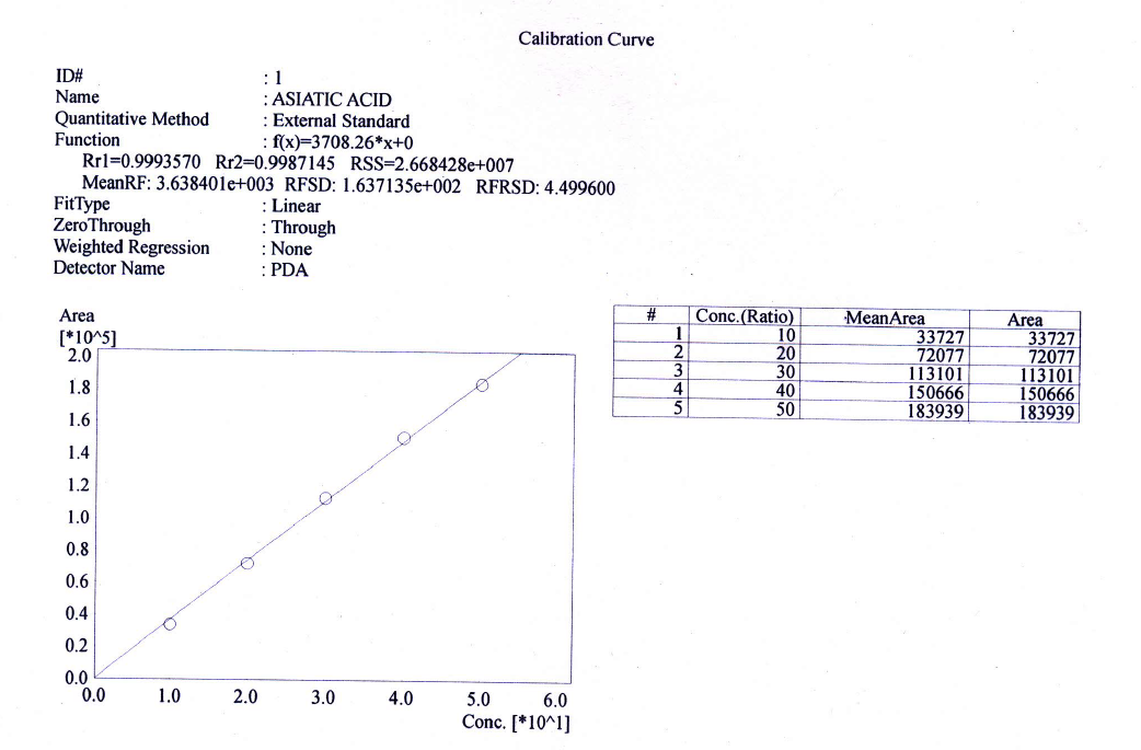 | Linearity range of Asiatic acid | 10-50µg/ml |