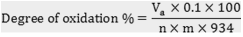 The degree of oxidation was calculated according to the following equation where Va is the consumed volume of NaOH solution (0.1 M) at the equivalence point, n is the possible number of aldehyde groups, m is the dry weight of oxidized XG and 934 g/mol is the molecular weight of the repeating unit of XG. In the case of xanthan gum, eight aldehyde groups can be formed per repeating unit by the cleavage of the C–C bond between adjacent–CHOH groups.