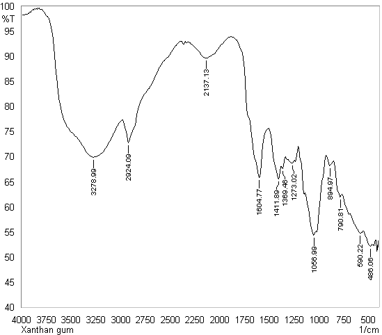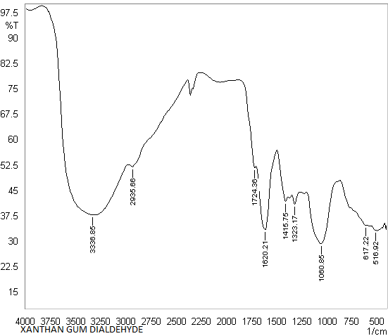 The FT-IR spectra of xanthan gum and xanthan gum dialdehyde were compared and it was represented in fig. 1a and b. FT-IR spectrum of xanthan gum showed absorption band at 1604.77 cm-1 and 1411.89 cm-1 was assigned to asymmetric stretching and symmetric stretching peak of the carboxylate salt group. The presence of aldehydes group was confirmed by C=O stretching band at 1724.30 cm-1.