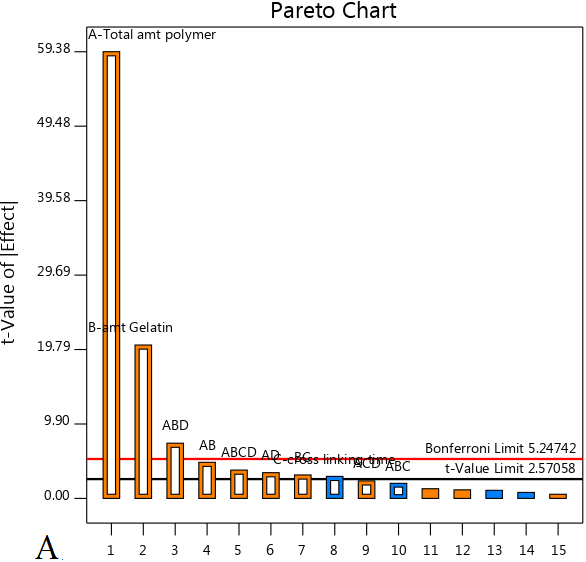 A factor was considered to influence the response if the effects are significant (p<0.05). A positive value indicates a synergistic effect that favors optimization, while a negative sign represents an antagonistic effect or inverse effect of the factor on the selected response [13]. When we study the optimization of formulation for 100 mg constant drug amount considering 70% CPR at 8 h and 100% Drug Entrapment Efficiency it was observed that 200 mg total polymer, 30% gelatin wrt total polymer and 6 h oxidation reaction time is the predicted optimized formula for around 91% DEE and 72%CPR at 8 h. This prediction matches with the formulation No. F5. It is shown in an equation that response Y1 (CPR at 8 h) was significantly influenced by the synergistic effect of total polymer concentration (A). For second response Y2 (percentage entrapment efficiency), the significant factors were identified as both the polymer and interactions of polymer and Xanthan gum dialdehyde.
