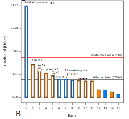 Fig. 2: Pareo chart of t-value of effect vs rank for the factor Y1(A) and Y2 (B)
