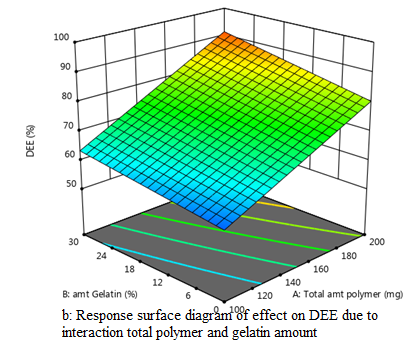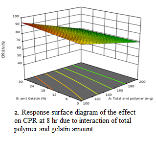 Fig. 3: Response surface diagram for the effect total polymer amount and presence of gelatin on CPR at 8 h (a) and DEE(b)