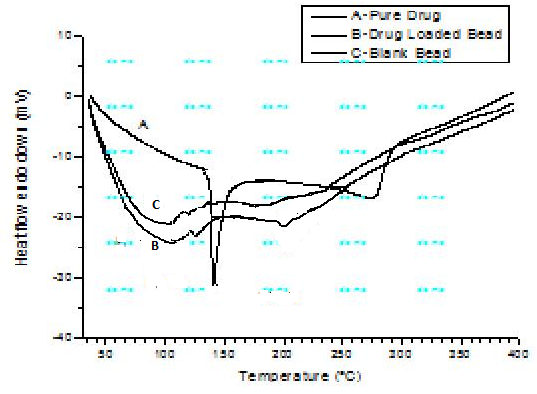 DSC thermogram of Xanthan dialdehyde cross-linked blank bead, drug-loaded bead and the drug metoprolol are displayed in fig.