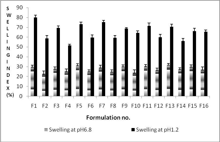 Fig. 6: Comparison of swelling ratio at 4h of all the formulations at different pH, all values are expressed as mean±SD, n=3
