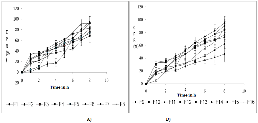Fig. 7: Comparison of In-vitro dissolution rate study of Formulation F1 to F8(A) and F9 to F16 (B) at pH 6.8 buffer, *All results were plotted as mean±SD, n=3