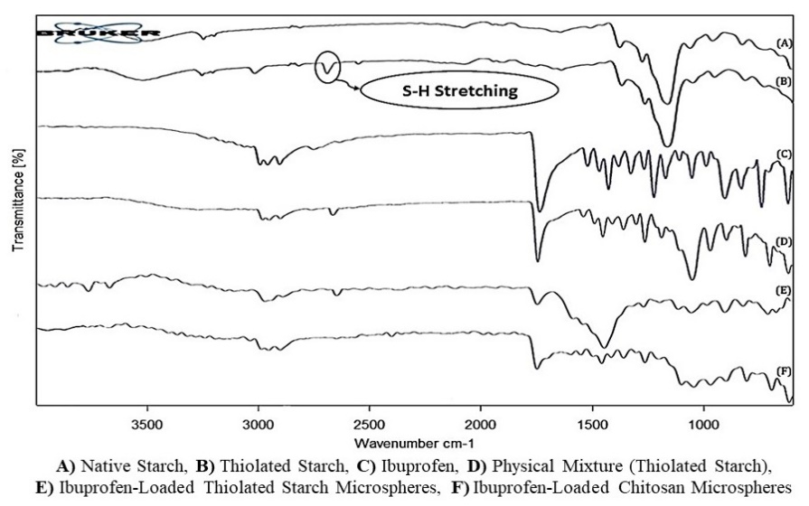 The FT-IR spectrum (fig. 2) of the pure drug ibuprofen, physical mixture and ibuprofen-loaded microspheres were obtained. From the FT-IR spectrum, it was observed that common peaks are present in both the spectra of native jackfruit seed starch and thiolated starch, but one extra peak i.e., S-H stretching (thiol group) at 2605.12 cm-1 appeared in the spectrum of modified starch which confirms that starch was successfully modified by the thiolation [65]. Ibuprofen showed typical absorption bands at 1703.18 cm-1 due to C=O stretching (acid group), at 745.93, 775.08 cm-1 due to C-H stretching (aromatic) and at 2917.75, 2949.32 cm-1 due to C-C stretching (alkane) vibrations. The FT-IR spectrum of physical mixture (Ibuprofen: Thiolated starch) and drug-loaded microspheres exhibited all the characteristics of absorption bands as that of drug ibuprofen without any notable variations [66]. The FT-IR spectra revealed that the drug has not gone through any kind of interactions with the excipients used and reserved its identity both in its physical mixture and formulation; indicate the no such interaction between the drug and excipients [67].