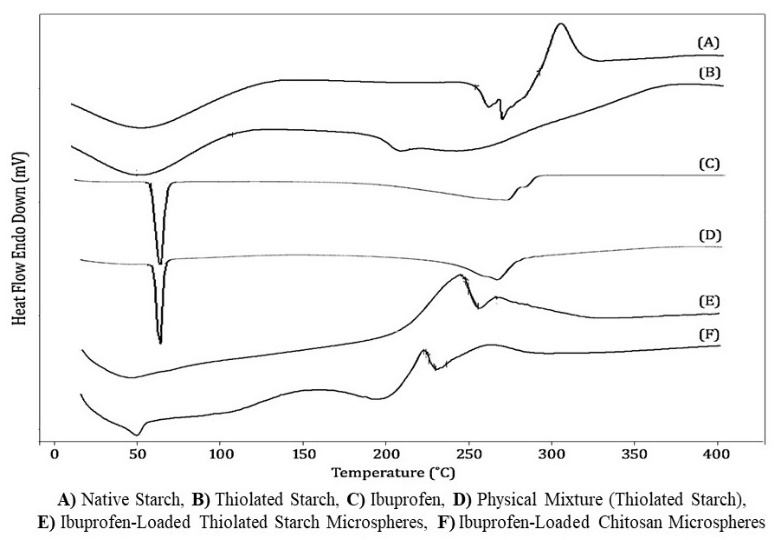 The DSC patterns of pure drug ibuprofen, physical mixture and ibuprofen-loaded microspheres were observed using Differential Scanning Colorimeter (DSC 4000, Perkin Elmer, U. S. A.). Around 5 mg of the sample was pinched in a standard aluminum pan and heated across a temperature range of 40 °C to 400 °C with a constant linear heating rate of 10 °C per minute. The DSC analysis generally used to examine the purity, thermal transitions, compatibility of drug and polymers [41].
