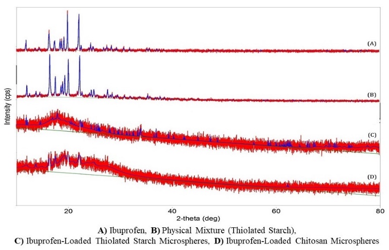 The impact of microencapsulation mapping on drug crystallinity was studied using XRD analysis. XRD patterns of pure drug ibuprofen, physical mixture and ibuprofen-loaded microspheres were recorded by X-Ray Diffractometer (Rigaku-Ultima IV, Japan), using Cu radiation, a voltage of 40 kV and a current of 30 mA. The scanning speed employed was 2 °/min above the range of 10 ° to 80 ° diffraction angle [42].