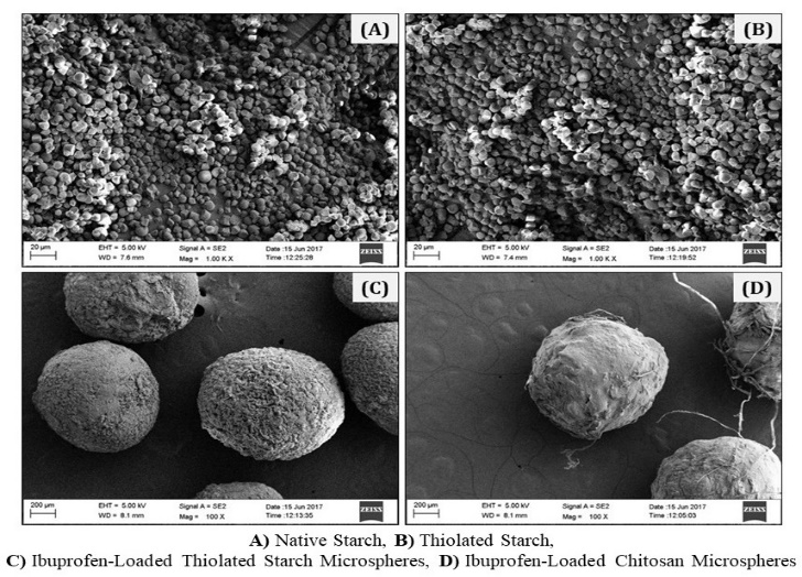 The SEM photographs affirmed that shape of starch granules were spherical and slightly polyhedral and the prepared microspheres were discrete, broadly spherical with rough surface characteristics and no such notable changes in the external surface of starch granules following thiolation and the surface of the microspheres was dense without any porous and some degree of roughness was observed in drug-loaded microspheres indicative of effective cross-linking [72].