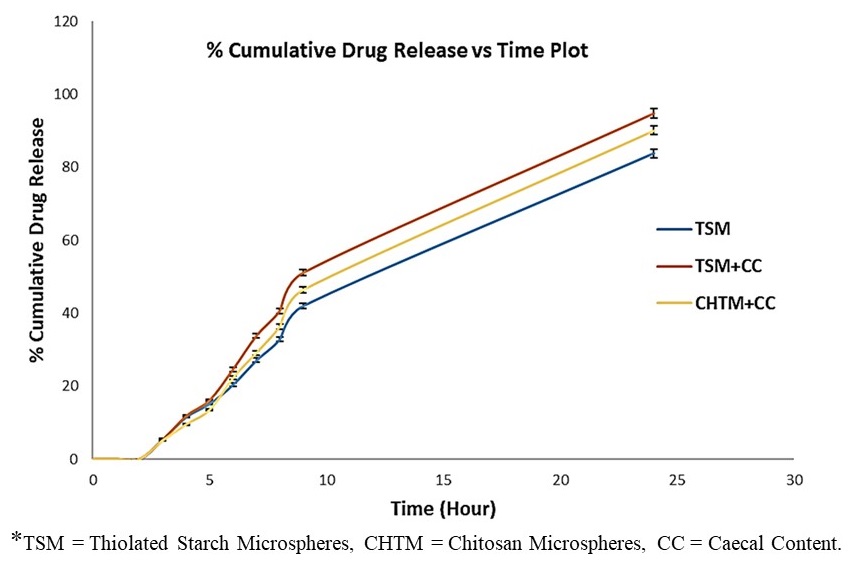 The in vitro drug release studies were performed by the USP Dissolution Test Apparatus Type 1 (Basket Type, LABINDIA DS 8000) in 900 ml dissolution medium at 50 rpm and the temperature of the medium was preserved at 37 °C±0.5 °C. An absolutely weighed amount of prepared microspheres (equivalent to 10 mg of drug) were used for the study. The experiment was performed using simulated GI fluid (SGF) pH 1.2 for the first 2 h. Then the medium was exchanged with phosphate buffer pH 6.8 for the next 3 h and then the medium was again exchanged with phosphate buffer pH 7.4 with rat caecal content up to 24 h. At regular time intervals, 5 ml of sample was withdrawn and replaced by 5 ml of the fresh medium after each sampling to preserve the constant volume (sink condition) during the whole test. The sample was filtered using 0.45 µm Whatman syringe filter and assayed spectrophotometrically at 222 nm using a UV-Visible spectrophotometer (Shimadzu, UV-1800, Japan) [45]. Rat caecal content was processed according to the method described in elsewhere. Simply, 2 albino rats of identical body weight (150-200 gm) with no earlier drug treatment were taken. The animals were weighed and provided on a normal diet. 30 min before to starting the experiment, each rat was humanely sacrificed and opened the abdomen. The caecum was traced in rats, bind at both ends with a ligature, dissected and instantly transferred into a phosphate buffer solution pH 6.8. The caecal bags were carefully opened; contents were processed, properly blended and then disbursed in phosphate buffer pH 7.4 to give the appropriate concentration of caecal content [46].