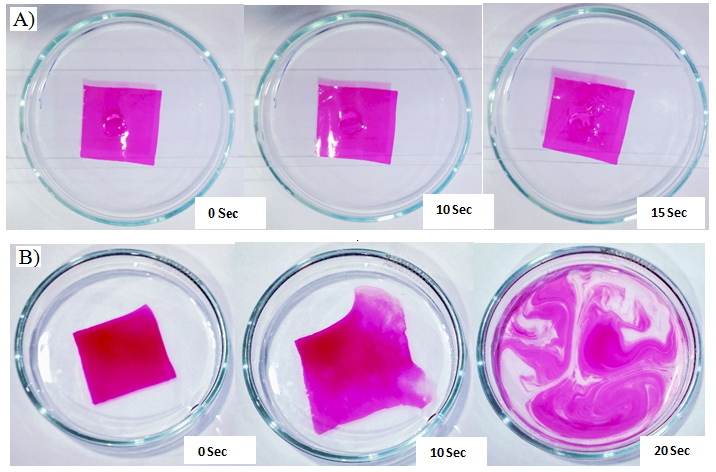 In this method, 2 ml of distilled water was placed in a petri-dish and a film of 2x2 cm2 was placed on the surface of the water and the time required to dissolve the film completely was measured. The estimations were carried out in triplicate [18].