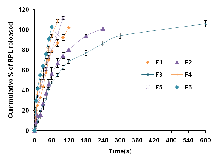 In the present investigation, in vitro, drug release studies of MDFs were carried out using USP Type-V Dissolution Rate Testing Apparatus. 500 ml of artificial saliva was used as dissolution medium in order to mimic the in vivo conditions. The in vitro drug release profiles of ramipril MDFs are shown in fig. 5.