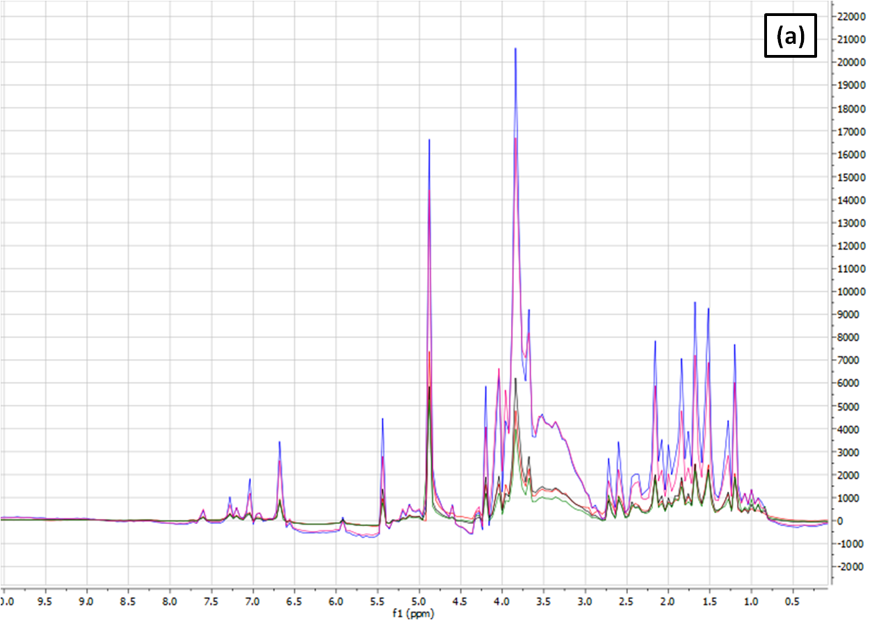 The 1H-NMR spectra were automatically reduced to ASCII files using MestreNova software (v. 12.0, Mestrelab Research, Santiago de Compostela, Spain). Spectra intensities were reduced to buckets with the spectral width δ 0.04 forming a region of 0.08-10.04 ppm and the total variables of 250 chemical shifts bin were generated for each 1H-NMR spectrum. The generated ASCII files were subjected to PCA and PLS-DA using XLSTAT add-ins (v. 2018.2.50198) integrated with Microsoft Excel.