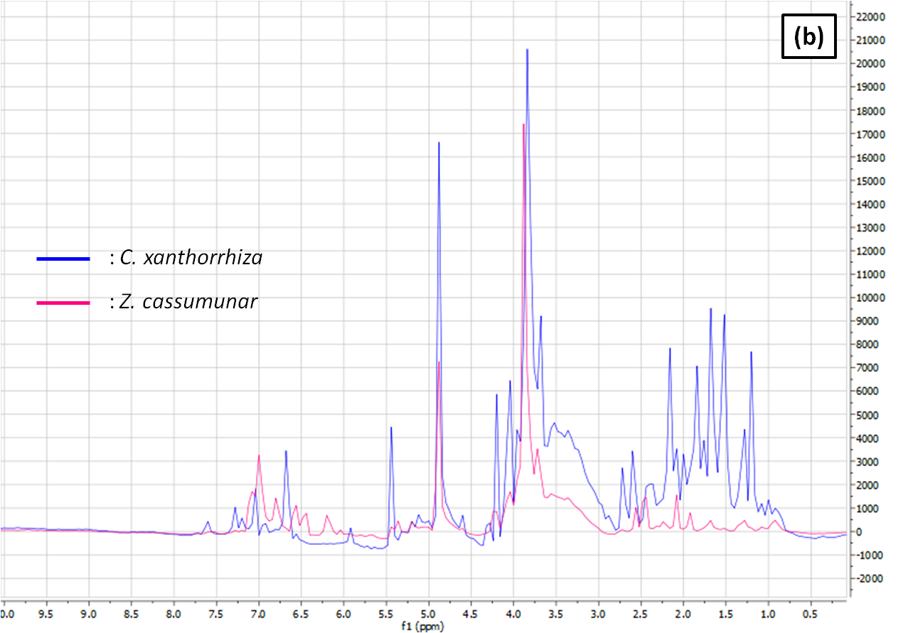 Proton (1H)-NMR metabolite fingerprinting and chemometrics has been used for the authentication of Curcuma longa adulterated with Curcuma manga [13]. In our best knowledge, there is no publication regarding authentication of C. xanthorrhiza extract which is adulterated with Z. cassumunar. This study proposed the application of metabolite fingerprinting for the authentication of C. xanthorrhiza adulterated with Z. cassumunar using 1H-NMR spectroscopy and chemometric methods of PCA and PLS-DA. With PCA, separation of samples based on the pattern of the signals in the spectra could be accomplished. Meanwhile, by conducting PLS-DA, classification of pure and adulterated samples could be developed. Therefore, this study was aimed to develop sufficient and suitable techniques (combination of 1H-NMR spectra and chemometrics) as very powerful tools for the authentication of C. xanthorrhiza extracts.