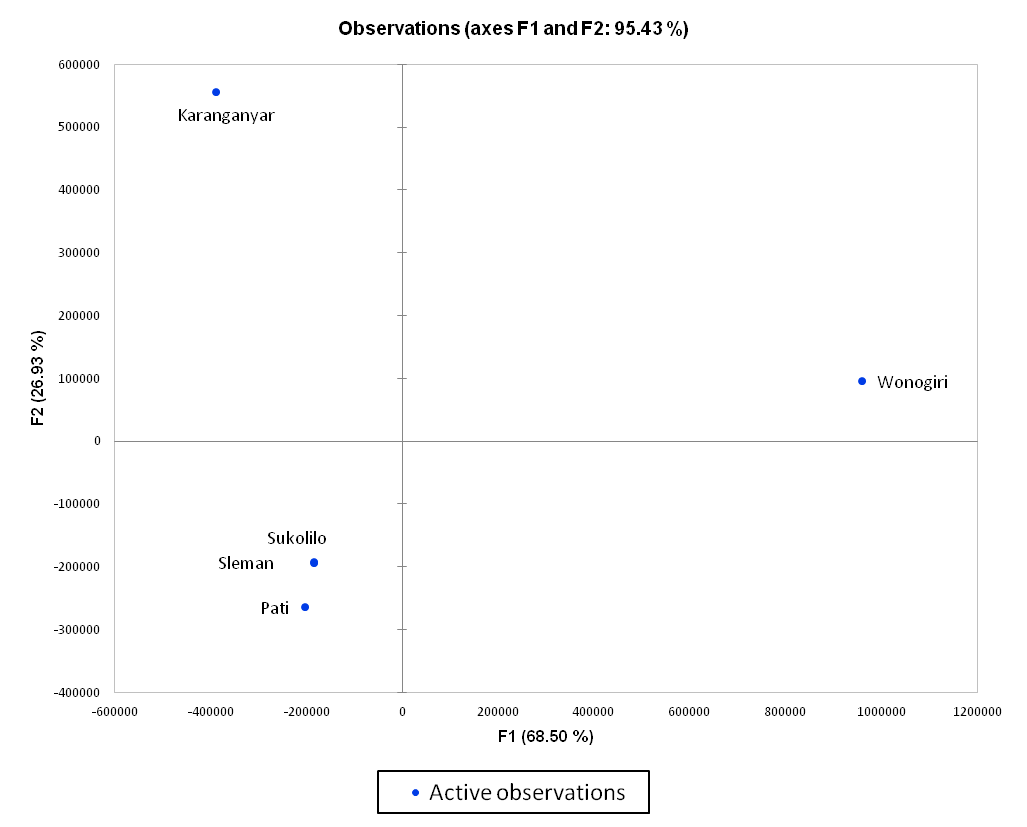 After the 1H-NMR spectra were reduced to buckets and converted to ASCII files, principal component analysis (PCA) was carried out to observe the differences between the spectra of each sample. PCA is an unsupervised pattern recognition method used to decrease the dimensionality of the multivariate data set while conserving most of the variance within it [15, 16]. Fig. 2 showed PCA score plot of the 1H-NMR spectra of C. xanthorrhiza extract from different origins. C. xanthorrhiza from various regions were mapped in three well-separated clusters that took place in the first two factors (Fs) which cumulatively account for 95.43% of the variation. The first factor (F1) unfold the differences of C. xanthorrhiza from various regions for 68.50% variance. C. xanthorrhiza from Sukolilo, Sleman, and Pati were located in negative side of F1 and F2, and were clearly separated from either C. xanthorrhiza from Karanganyar or Wonogiri.