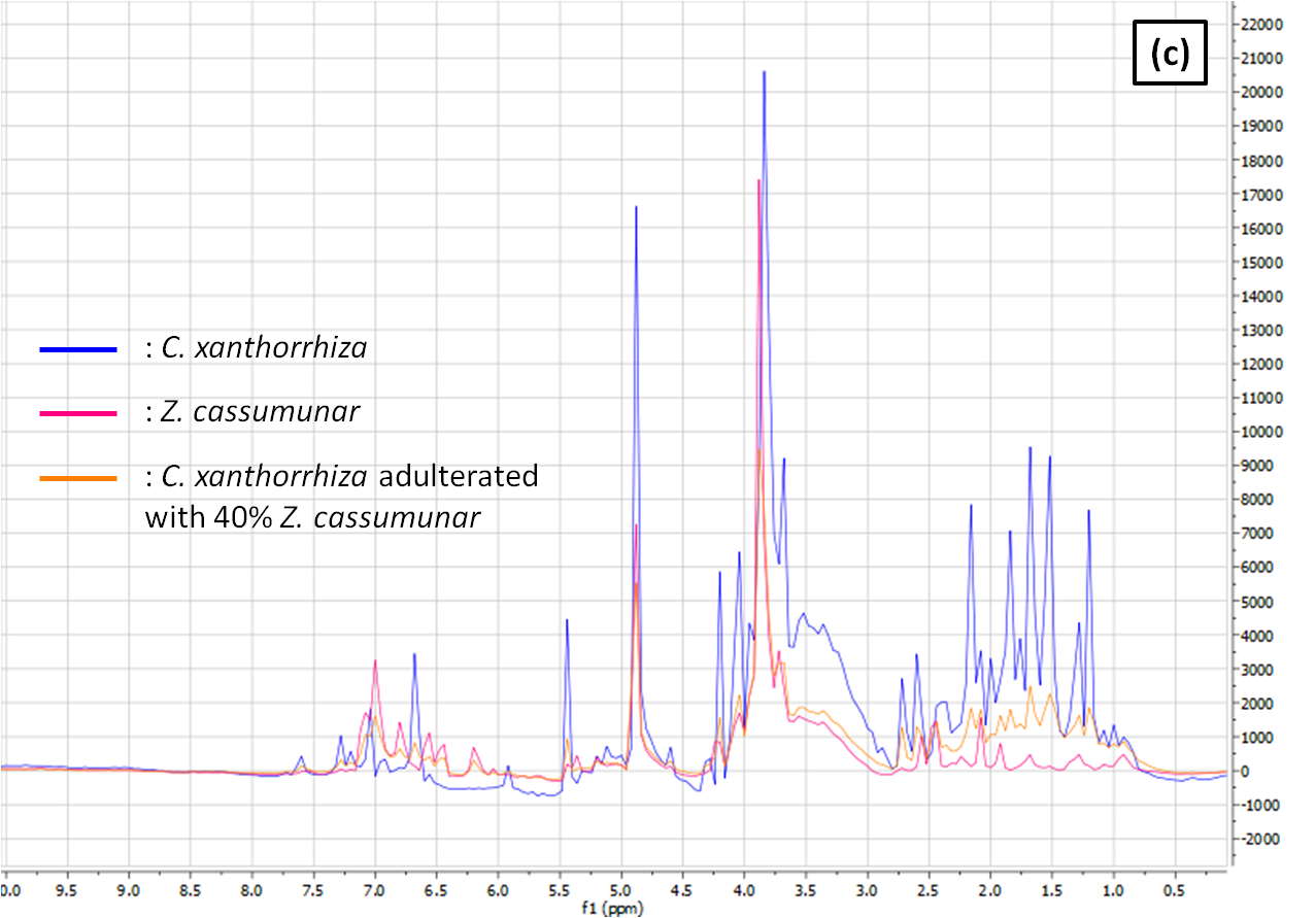 Fig. 1: 1H-NMR spectra of (a): Curcuma xanthorrhiza from different regions; (b): Curcuma xanthorrhiza and Zingiber cassumunar; (C): Curcuma xanthorrhiza, Zingiber cassumunar, and Curcuma xanthorrhiza adulterated with 40% Zingiber cassumunar