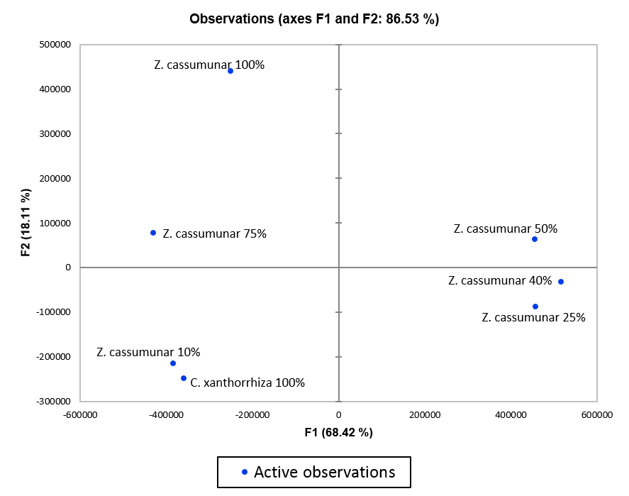Conclusion: The developed method could be a useful and powerfull tools to assess adulteration practice and to evaluate the authentication of C. xanthorrhiza extracts.