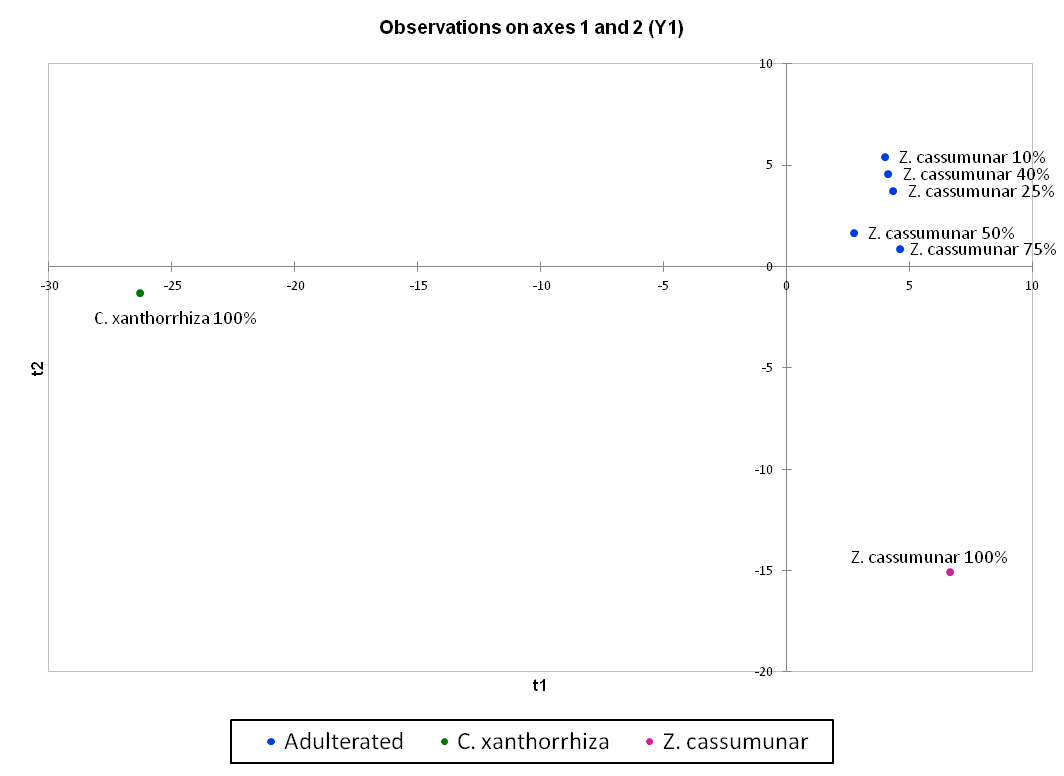 Metabolite fingerprinting using 1H-NMR spectroscopy and chemometrics proposed in this study could be applied for the authentication of C. xanthorrhiza adulterated with Z. cassumunar. The combination of chemometrics of PCA and PLS-DA allowed the consistent discrimination and classification of pure C. xanthorrhiza and C. xanthorrhiza adulterated with Z. cassumunar.