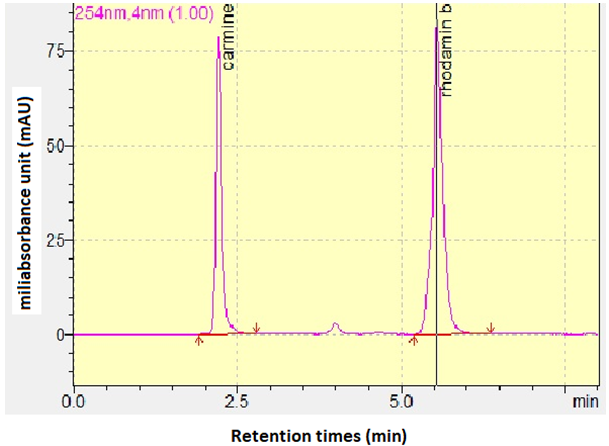Fig. 2: The separation of Carmine and Rhodamine B using the optimized RP-HPLC condition