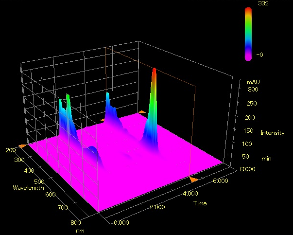 The advantage of PDA detector is the capability to provide the purity index of spectra of corresponding analytes (CAR and RHO B). PDA detector can analyze peak purity by comparing spectra of analytes within a peak. A pure peak has matching spectra throughout the peak (at all wavelengths). Both CAR and RHO B have the purity index >0.9999 and were considered as pure, meaning that the eluted peaks were of CAR and RHO B. PDA detector can also monitor analytes at more than one wavelength. This is especially useful when the wavelength maxima of the analytes are different. Wavelengths can be selected to analyse each compound at its highest sensitivity. Fig. 3 revealed the 3D spectra of CAR and RHO B at wavelengths of 245-600 nm.