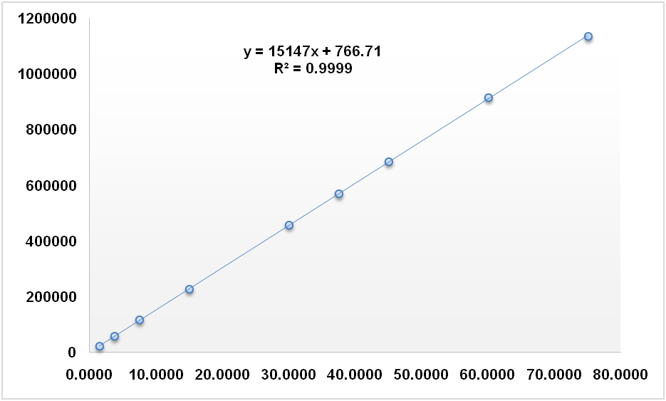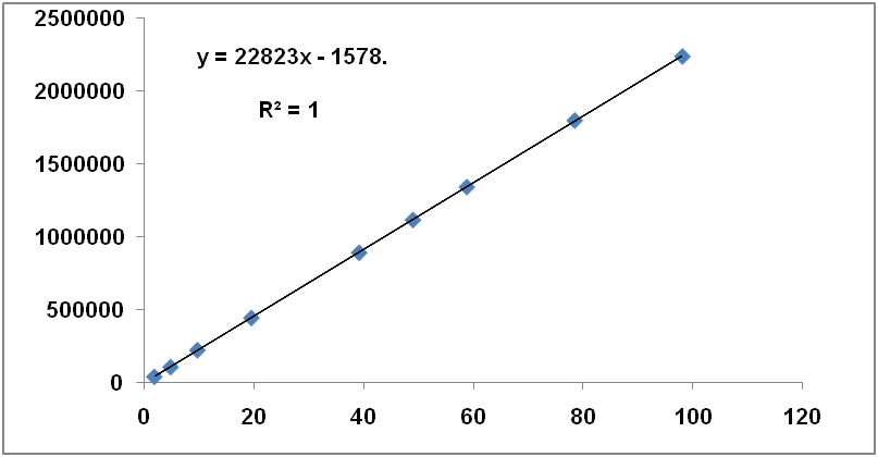 Fig. 4: The relationship between the concentration of carmine and rhodamine B (x-axis) and peak area (y-axis)