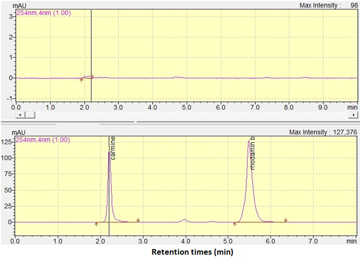 Reversed phase high-performance liquid chromatography (RP-HPLC) is the most commonly methods used for separation of dyes including CAR and RHO B because of its accuracy, precision, sensitivity, time efficiency, low cost and robust [16]. The different polarity between CAR and RHO B could be separated using C18 column. Fig. 2 exhibited the separation of CAR and RHO B using optimized condition. Both analytes (CAR and RHO B) were well separated with resolution value (Rs) of 15.10 indicating that RP-HPLC was selective. The system suitability test of RP-HPLC indicated that RP-HPLC system was reliable for quantitative analysis of CAR and RHO B as indicated that RSD values of retention times of CAR and RHO B as well as peak areas of CAR and RHO B were less than 2% [17].